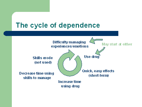 While the line between use and dependence has been subject to much debate, increased dependence can be thought of as difficult for the person using to quit, higher relapse rate, self-rated need for the substance, and the degree to which the substance will be used in the face of evidence that it causes harm (Henningfield, 1994). The cycle of dependence illustrates the Catch-22 some people find themselves in, where a way of dealing with problems becomes itself problematic. Where, as author Lois Simmie (2001) writes, 'comfort became a crutch became an illness'.