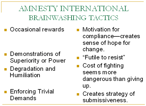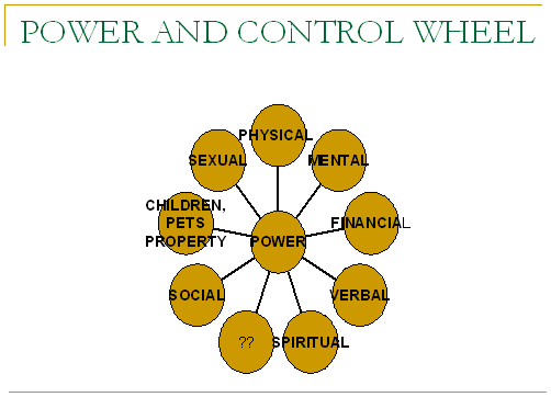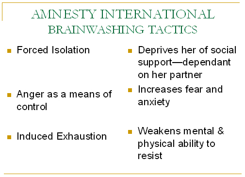 The Power and Control Wheel is a useful tool to illustrate the range and types of abuse that women are subject to in abusive relationships. The cumulative effect of using many abusive strategies is that abusive partners weaken their partners's ability to protect themselves and gain and maintain power and control over their partners. It is interesting to note the similarity between women's experience of abuse and Amnesty International's description of brainwashing tactics.